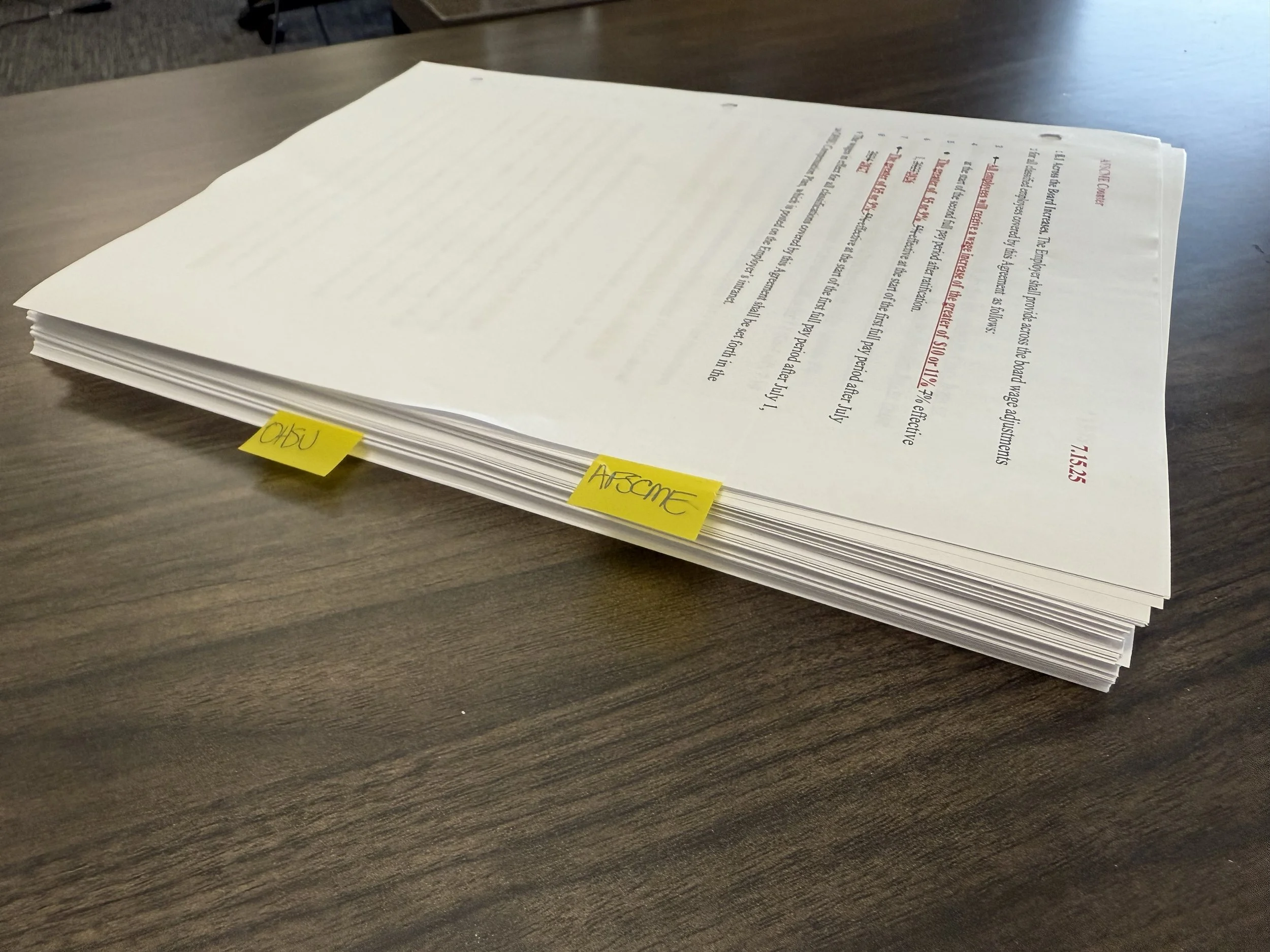 A stack of proposals with yellow tabs denoting that the top of the stack came from AFSCME and the lower roughly 1/3 from OHSU. The stack is well over 100 pages and appears to be between 1 1/2 to