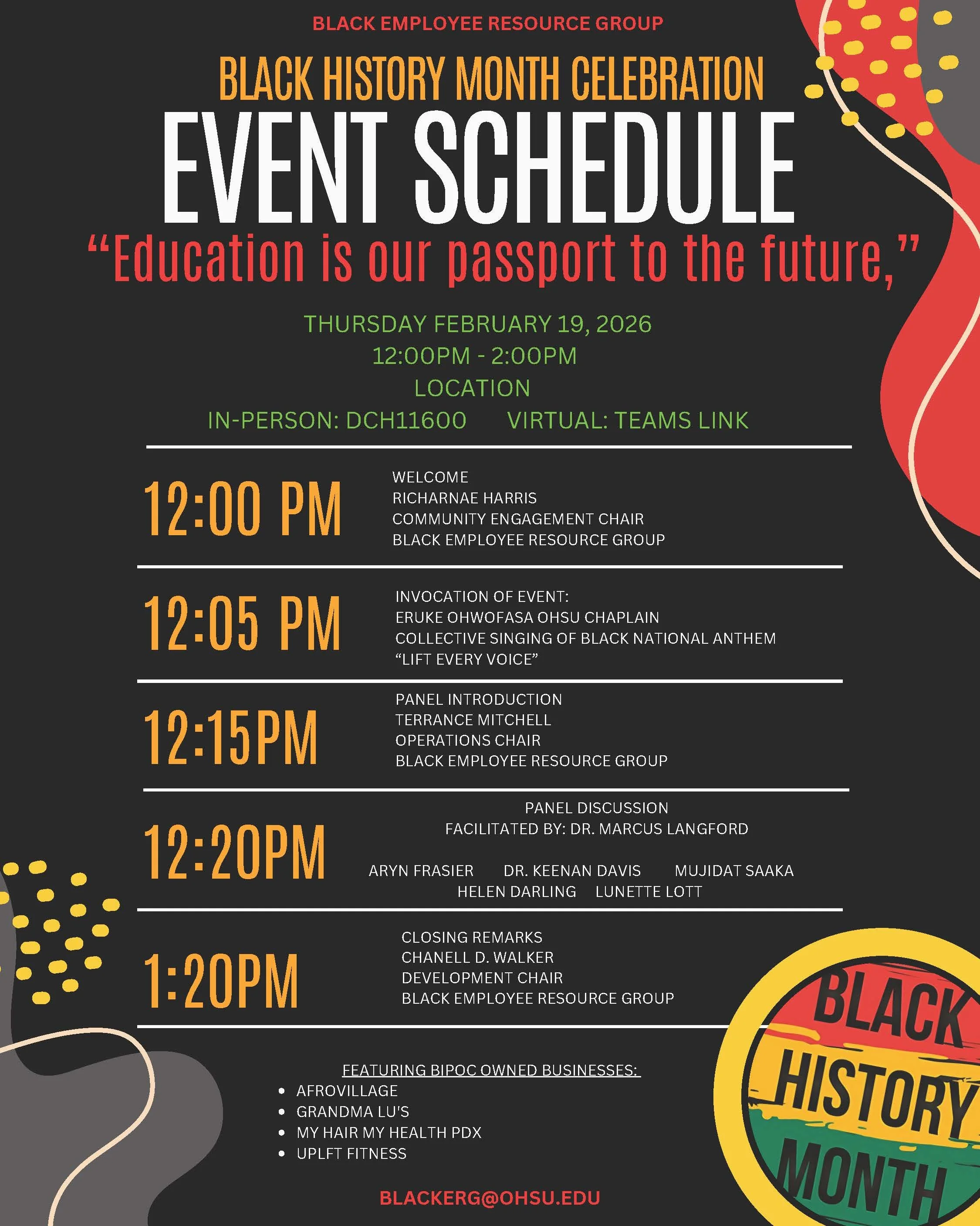 The Black ERG, open to all faculty and staff, hosts networking and skill development events, with a specific emphasis on enhancing cultural competency and advancing diversity and inclusion. To get involved, email blackerg@ohsu.edu.